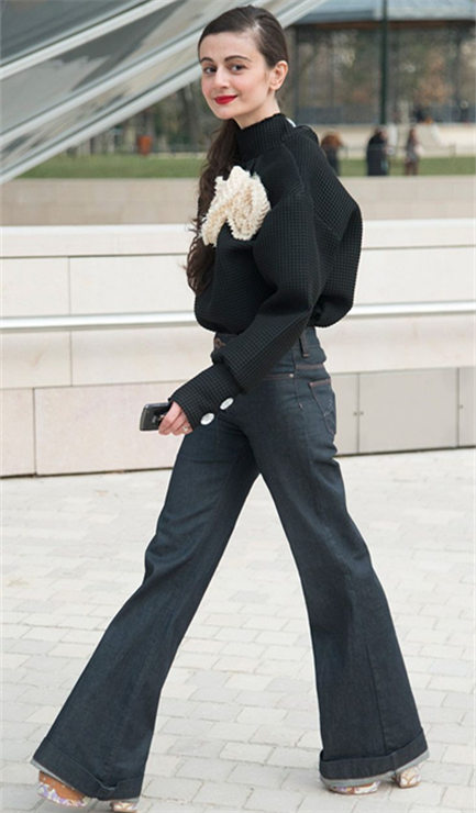 传说中的高腰阔腿裤盖住鞋面就是这样子的,NataliaAlaverdian的搭配就是一个很好的例子哦。除了这个小心机,还有上衣的胸花装饰也是转移注意力全身至高的焦点哦~