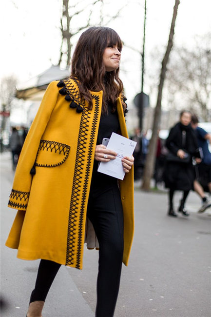 装饰性强的大衣非常时髦吸睛,也会让人觉得有些夸张,搭配“一码黑”除了收敛张扬气还兼具显瘦效果。但是前身一片黑未免单调,手中的白卡纸可不是随意拿的,你懂得。