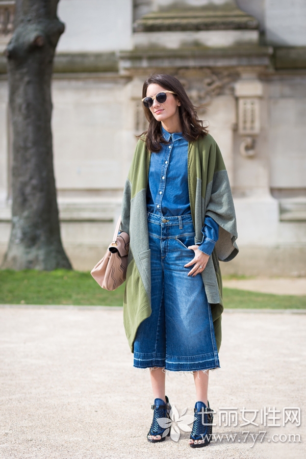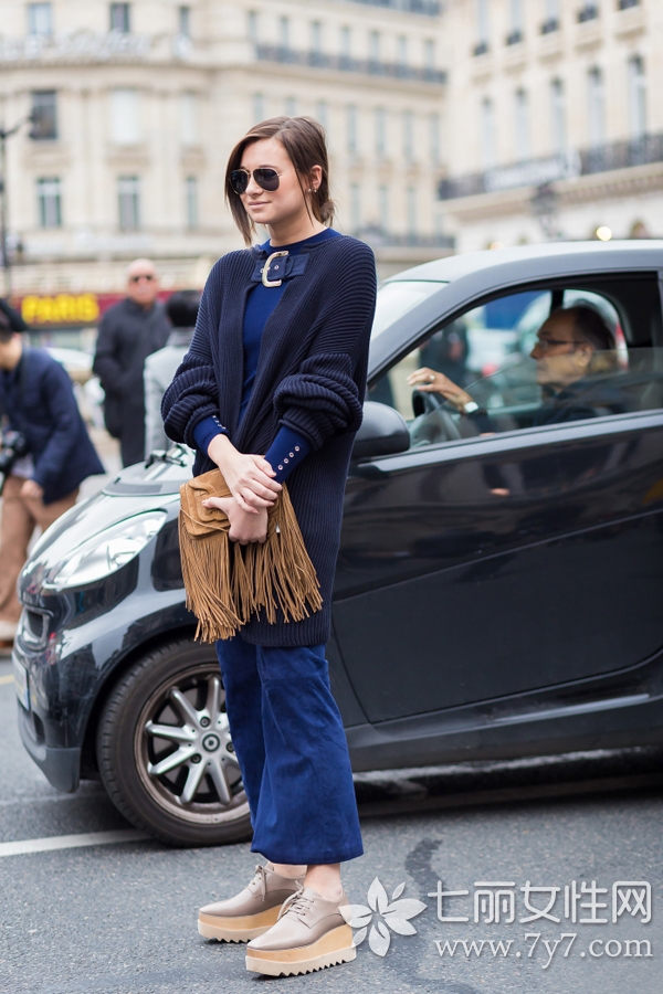 何穗最新街拍,灰色毛衣+墨绿色光泽感半裙,文艺慵懒,少女感十足。马海毛毛衣来自H&M,手提包和粉色毛拖鞋均来自Gucci,半裙来自Tibi 2016