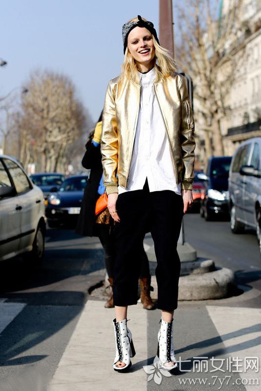 短靴较长靴看上去更加便捷轻巧,搭配夹克型衣服最为不错。图中搭配金色棒球外套就给人一种时髦帅气的感觉。