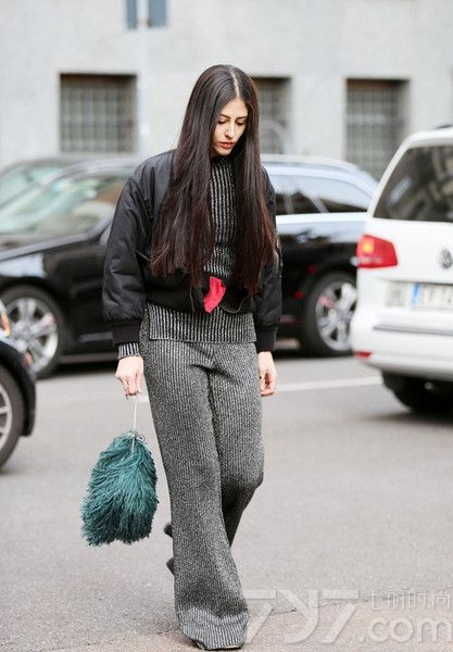 宽松的针织阔腿裤上穿一件紧身的外套,优雅不失大气。带上翠绿色的包包让整个造型不再那么沉闷。