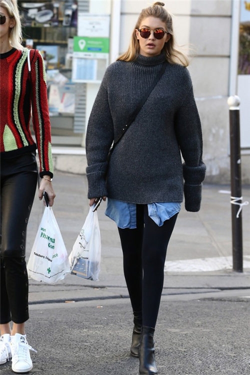 今年hot的高领毛衣搭配牛仔衬衫露出衣摆丰富整体造型,打破中庸的穿法。