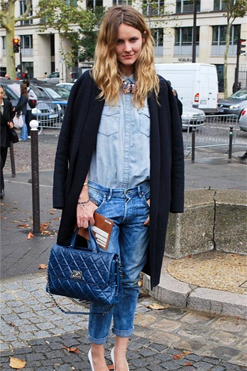 大衣外套里面搭配牛仔衬衫最时髦的搭配方法是裤装与牛仔衬衫同色,想要更加有层次感,选择破洞款的牛仔裤更加潮。