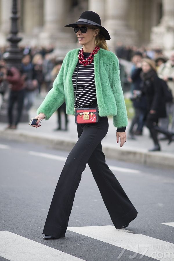 通过黑色的中和,绿色的外套大胆的加上红色的项链和包包,显得活泼可爱,再也不必担心会像一棵圣诞树啦,两种颜色搭配的技巧在于特别要注意两种颜色所占得比重。
