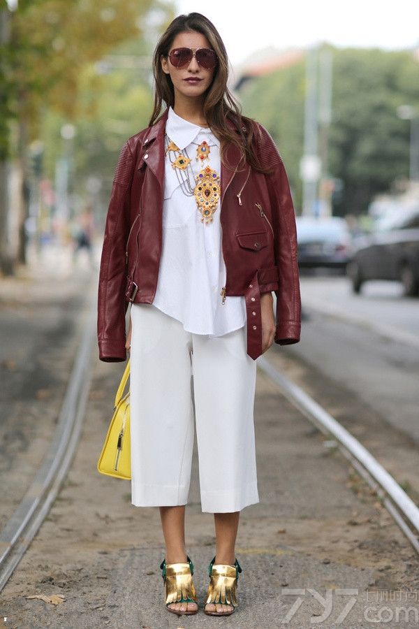 酒红色与白色的搭配略显单调的时候,金黄色系的单品和配饰的加入使得整个造型会立马丰富起来,让你与众不同。