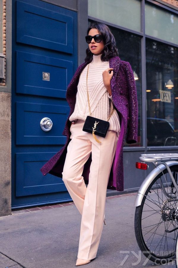 搭配紫色的披肩大衣使整个人看起来气场十足,不经意透露着女王气质。