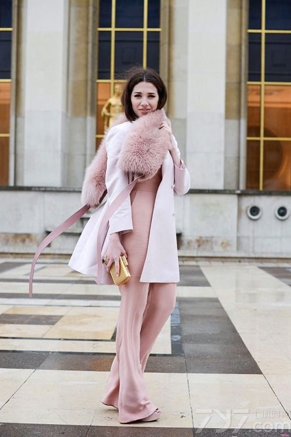 偏裸色的粉色系本身就带有慵懒女人味,加上金色的手包和皮草披肩使整个人看起来就是时髦又韵味十足。