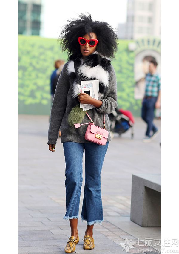 如果紧身裤使你厌倦了,那么一条紧身喇叭开口的裤子也是不错的选择,选择小号的包包进一步加强视觉的对比。