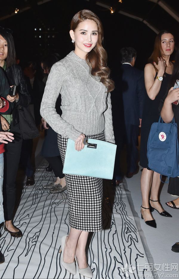 昆凌这身造型在千鸟纹包臀铅笔裙的加入下使原本充满学生幼稚气的毛衣变得成熟优雅起来。