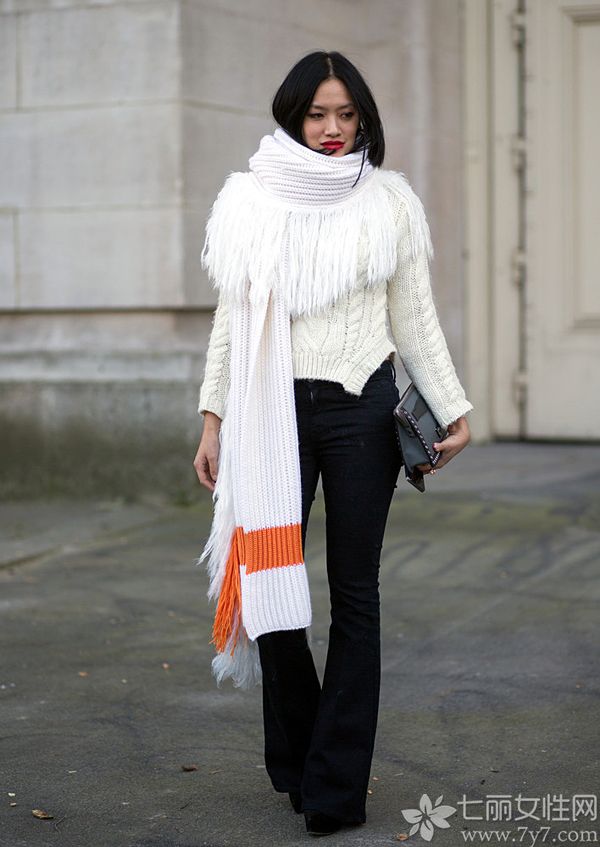 短款的米白色毛衣和黑色的喇叭裤都是显高加分的单品,小号的手包使整个造型对比更强,而裤脚再把高跟鞋盖住在显高的路上越走越远。