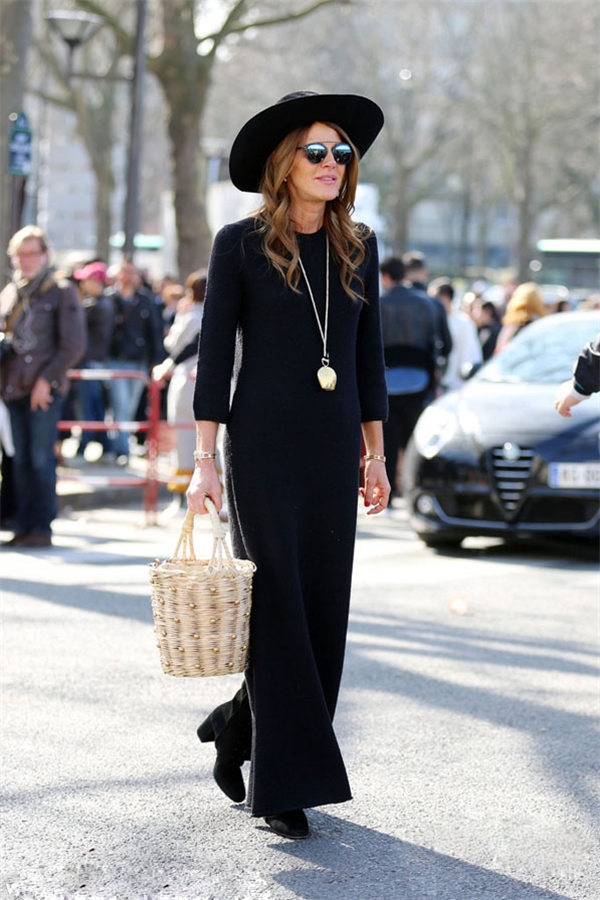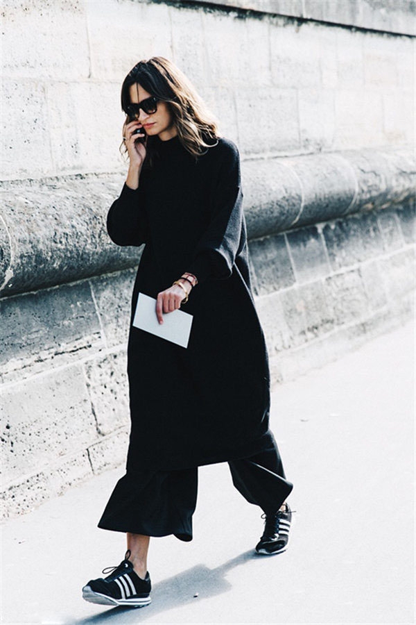黑色长款针织连衣裙搭配黑色阔腿裤这种"长长组合“搭配今年非常的流行。搭配运动鞋完美打造“Normcore"风格。