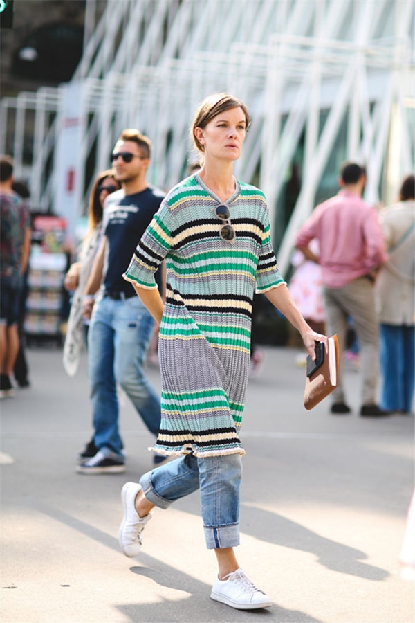 色块拼接的修身针织连衣裙带来视觉冲强烈击感,搭配运动鞋透露出复古时髦味。