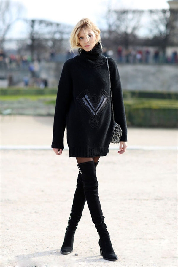 一件慵懒温暖的高领毛衣连衣裙搭配性感过膝靴,简单大方时髦
