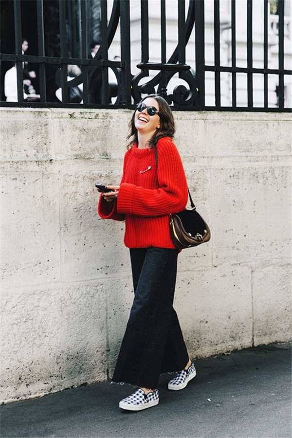 红色针织毛衣搭配阔腿裤旅行或者逛街的休闲舒适感觉。