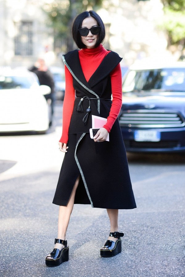 红色针织毛衣做内搭,与黑色套装搭配时尚大方。