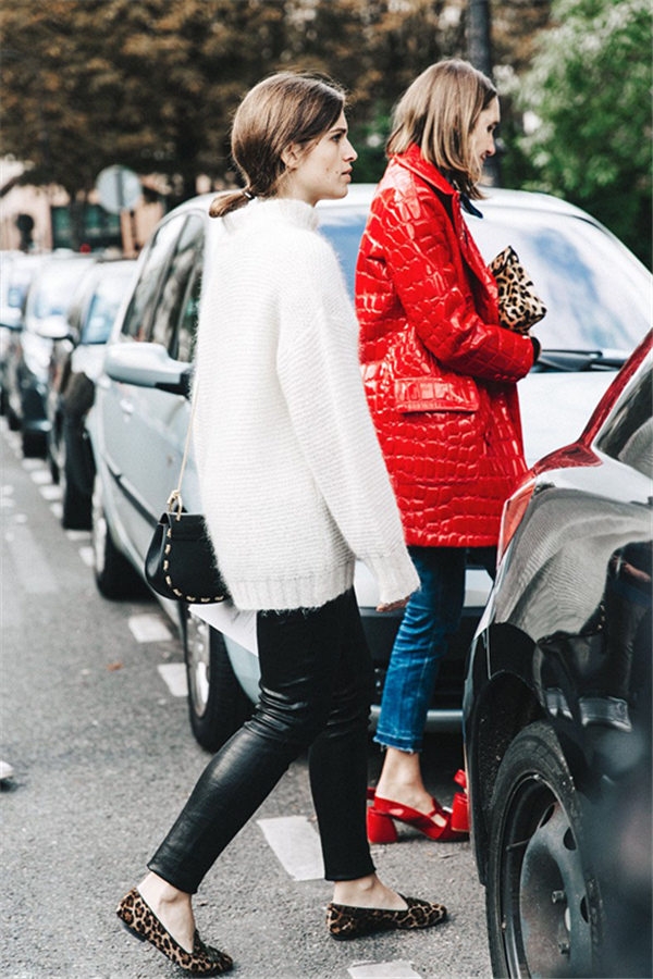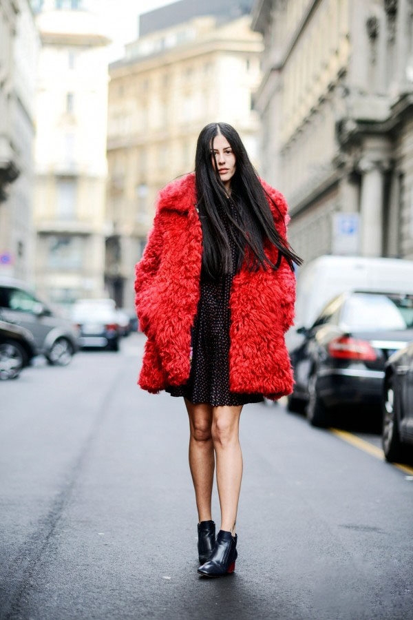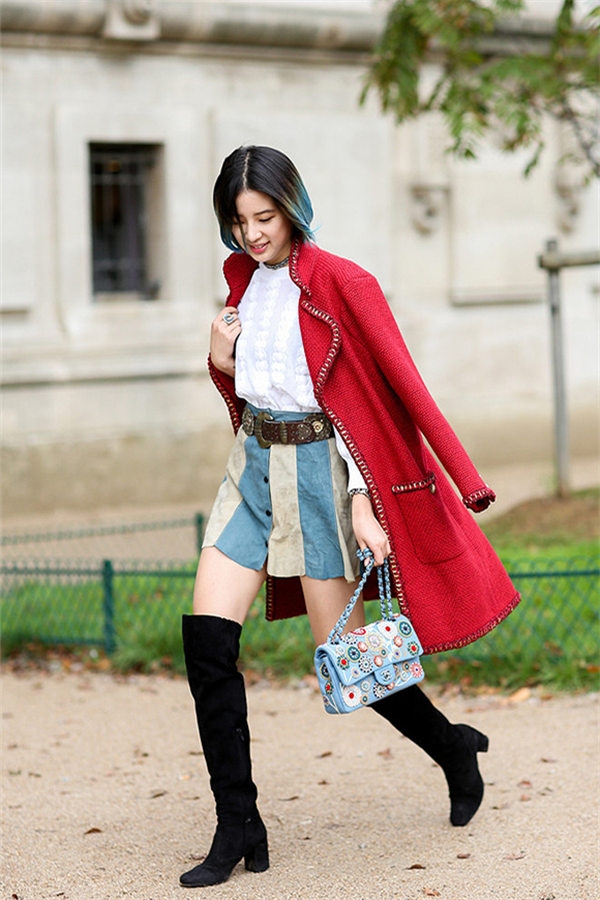 中长款的红色外套略带侵略性,白色可以有效化解这种强势而带来清新感觉。