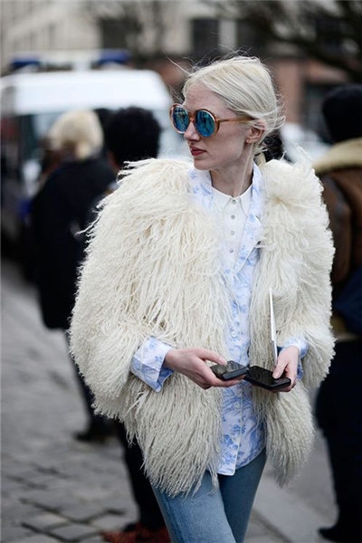 真的国外的老奶奶都太潮了。蓬松的白色皮草搭配浅蓝色的衬衫不显臃肿反倒带来一丝清新感呢。