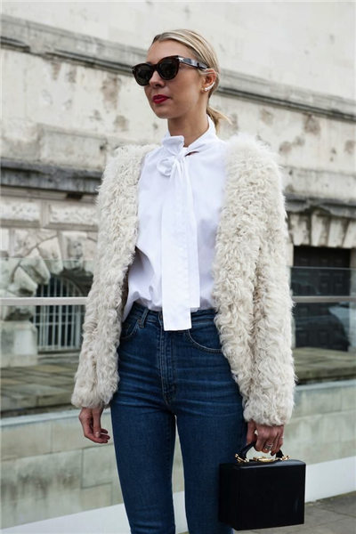 V型领的白色皮草短款内搭白色衬衫提亮肤色,蝴蝶结款式的衬衫是今冬大热款,女性的甜美和优雅都被释放。