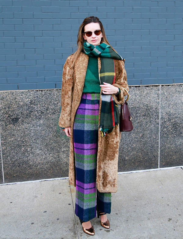 何穗最新街拍,灰色毛衣+墨绿色光泽感半裙,文艺慵懒,少女感十足。马海毛毛衣来自H&M,手提包和粉色毛拖鞋均来自Gucci,半裙来自Tibi 2016
