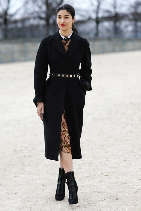 大衣上的毛绒细节和内搭相呼应,宝蓝色和黑色的大衣加上蛇纹高跟鞋充满女王气质。
