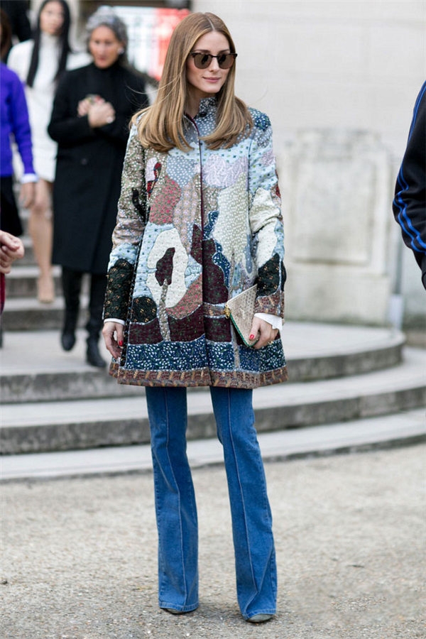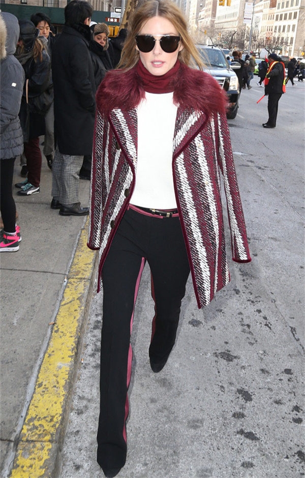 大家都知道Olivia Palermo的身高并不算高只有163cm,中长款A型大衣小个子是比较难驾驭的容易显矮,搭配裤脚及地的阔腿裤有拉长腿部线条的作用,而且与A型大衣形成阶梯形的对比视觉上带来时尚美感。穿着看上去自信大方。想要穿出高级感,就要注意上下一致使用同色系的搭配方法。
