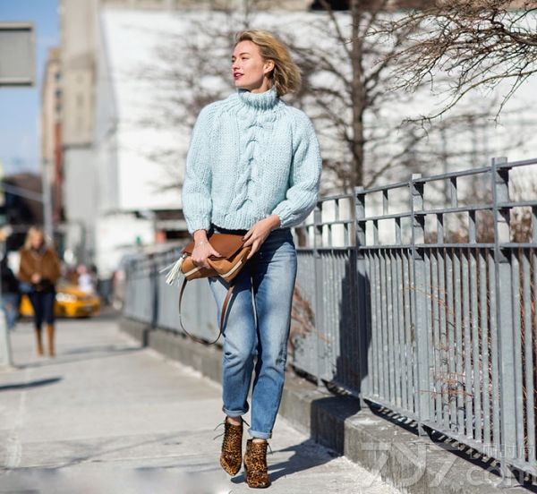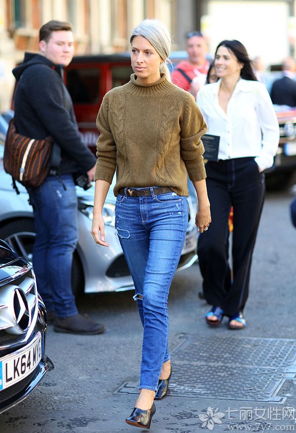 优雅混搭,两件复古单品的碰撞使单调的高领针织衫不再沉稳,牛仔裤是天生的搭配调剂好帮手,它的加入不仅显得整个造型轻松不古板而且非常时髦。
