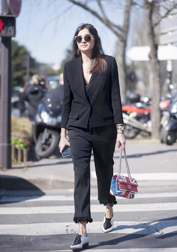 同样是设计感十足的九分西裤,花边的设计使整个黑色的造型也不那么沉闷,低调而又有细节可看。