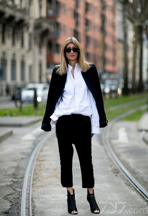 黑白色的套装穿的太正式别人还以为你是某个地产经纪人,为了摆脱这种感觉你可以换上一条九分西裤露出你的脚踝再穿上一件有设计感的衬衣,nice。
