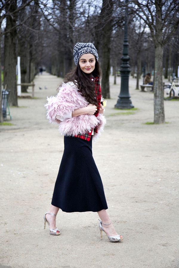 何穗最新街拍,灰色毛衣+墨绿色光泽感半裙,文艺慵懒,少女感十足。马海毛毛衣来自H&M,手提包和粉色毛拖鞋均来自Gucci,半裙来自Tibi 2016