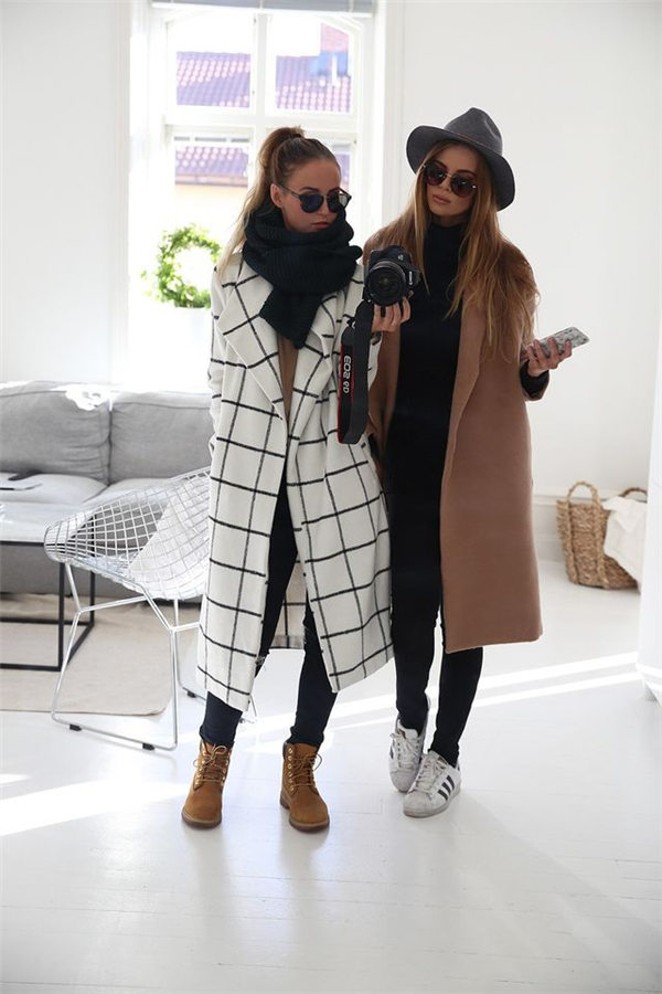 格子大衣搭配sneakers带来运动混搭时尚,充满活力。