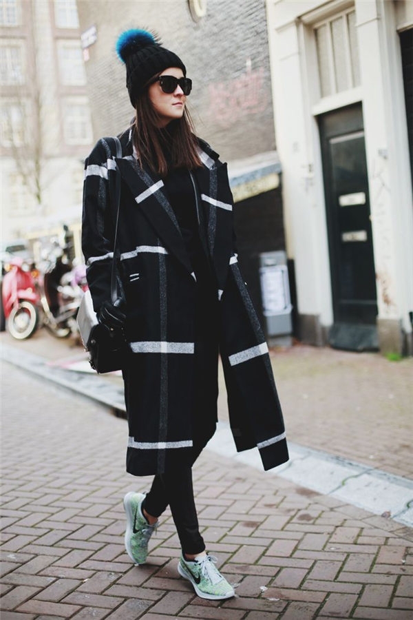 Look4:格子大衣+“一身黑”+运动鞋