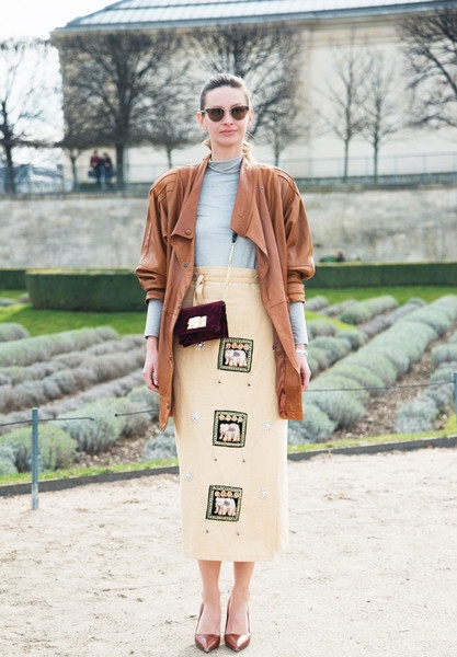 褶皱的外套卷起袖口使内搭看起来更纤细,加上高腰设计的裙子使整个人看起来更高。
