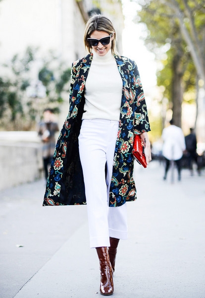 高腰的裤子和及膝靴的搭配让人看起来高了不止五公分,敞开的外套修饰完美身材。