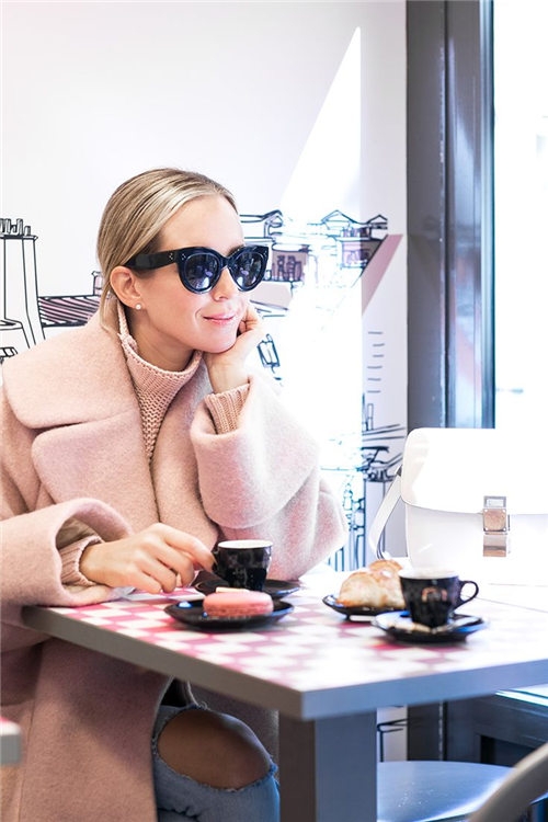在一个心情好的日子穿着粉大衣坐在甜品店吃吃下午茶,享受甜蜜的美妙时刻。