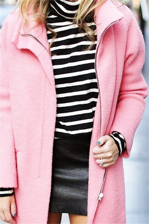 粉色大衣怎么搭配增加醒目感?黑白相间的上衣相当打眼,让你的起色看上去也得到很好调节。
