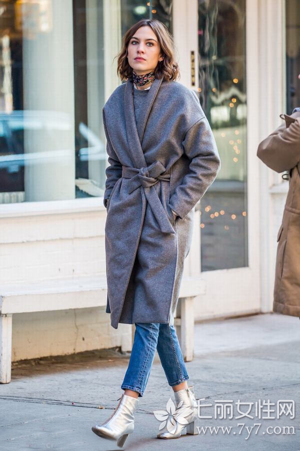 高冷灰是服装中比较流行的色彩,与其它单品的组合也很易穿出高级感,突显女生知性的一面。图中又加入了银色短靴来提高整体的逼格,显得颇有心机。
