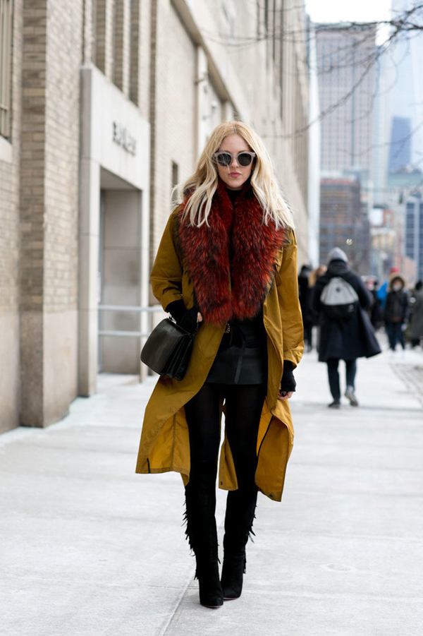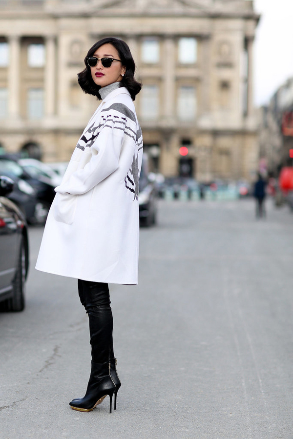 白色的大衣更显膨胀,黑色的紧身裤在大衣的衬托下轻松打造筷子腿,及踝靴的加入使得效果更甚一筹。
