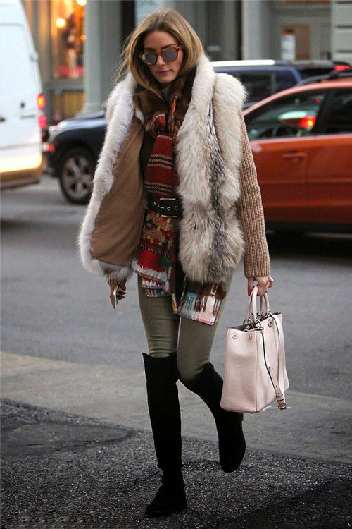 Olivia Palermo这身搭配真是绝了,为什么这么说呢听编编内心讲完。①皮草马甲搭配毛衣首先保暖做到位;②内搭同色系彩色围巾丰富造型层次,系一根腰带不仅显腰身还勾勒出高腰线;③铅笔裤束进过膝靴是时下最In的铅笔裤搭配法。时尚Icorn就是厉害!