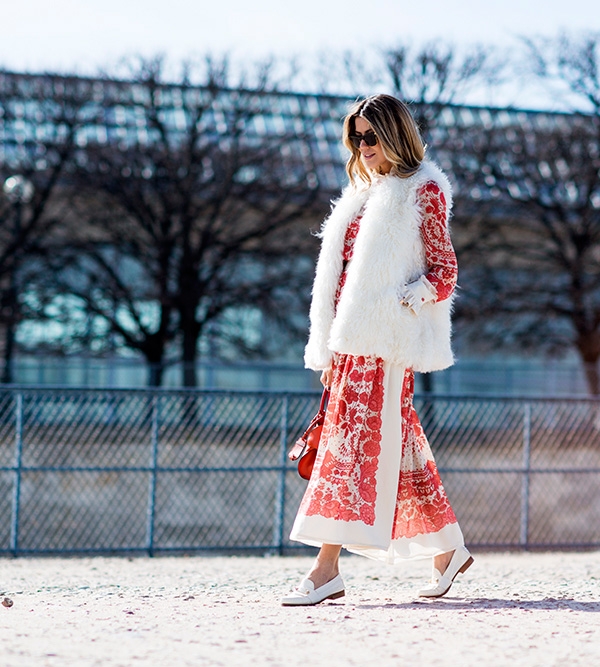 Look2:白色皮草马甲+红色连衣裙