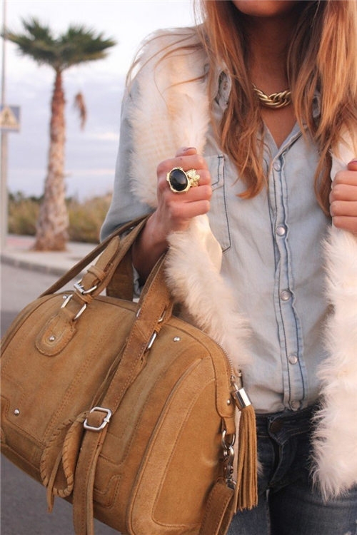 白色皮草马甲怎么搭配出清新感,当然是与天蓝色的牛仔衬衫最配。下身可以选择用色系的牛仔裤相当chic哦~