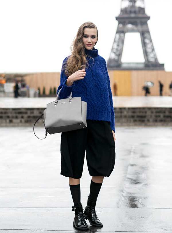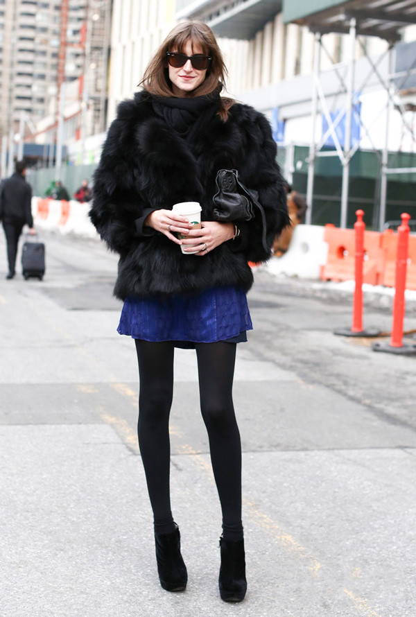 一身黑的搭配知识加入一条蓝色的超短裙也非常时髦,干净利落又有看点。