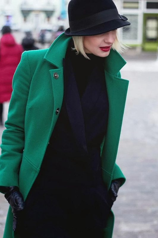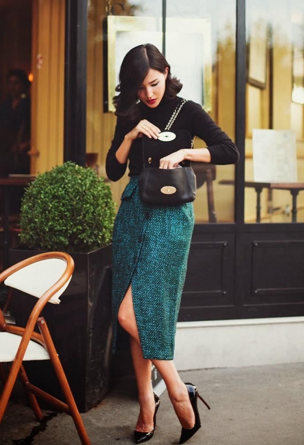 黑色的高领针织衫和绿色的开叉裙即使这样简单的搭配也让整个人看起来非常有气质充满女人味。