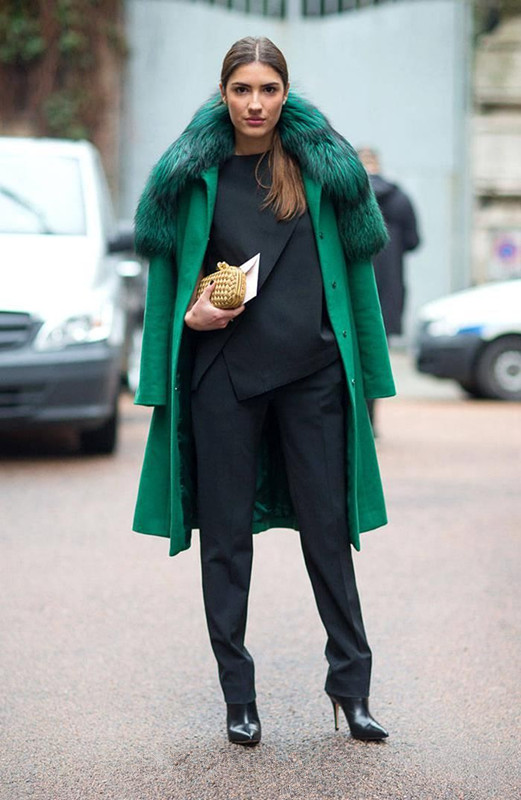 黑色和绿色的搭配使服装看起来非常高级有质感,手拿金色的收纳包更显贵族气质。
