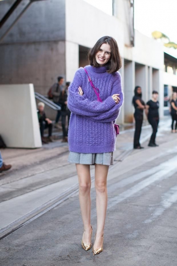 紫色的贸易加灰色的超短裙非常养眼,金色的鞋子让紫色在日常穿也显得非常高贵。