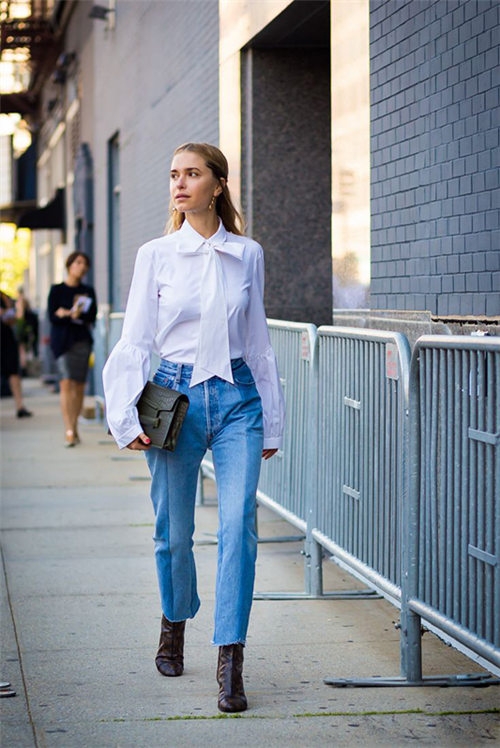 这是她在街头秒杀菲林较突出的装扮。复古的牛仔裤搭配设计感的衬衫非常的出彩。现代与怀旧feeling 的结合的恰到好处。
