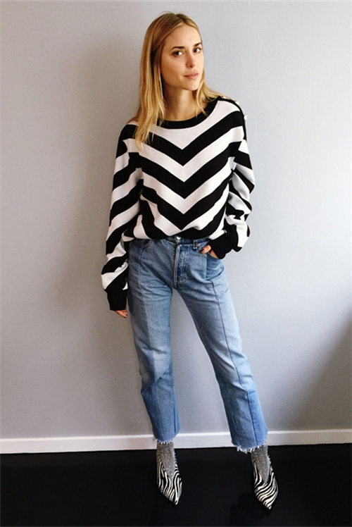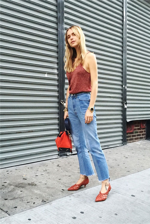 PernilleTeisbaek选择上下呼应法来搭配高腰牛仔裤,强调整体感,也就是说当你有一些很出挑个性的单品,在元素或色彩或材质上相同,实用呼应的法则会非常的搭,高腰牛仔裤起到铺垫作用。
