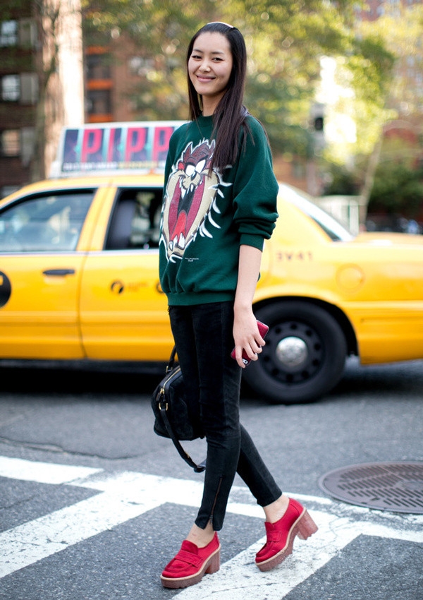 何穗最新街拍,灰色毛衣+墨绿色光泽感半裙,文艺慵懒,少女感十足。马海毛毛衣来自H&M,手提包和粉色毛拖鞋均来自Gucci,半裙来自Tibi 2016