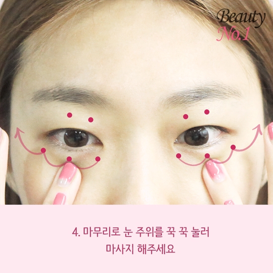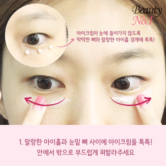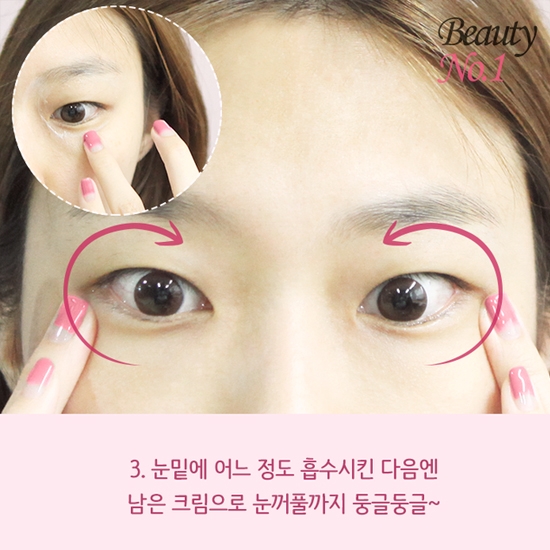 用无名指在眼部滑动打圈,方向是从眼头开始,由下眼睑往上眼睑方向,如图的方向,也是切忌来回方向涂抹。