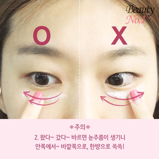 使用无名指按摩,从眼头往眼尾在下眼睑延展眼霜,促进吸收。按同一个方向就是肌肉的走向延展涂抹,切忌来回方向涂抹,如果按照右边的错误方式涂抹,会增加眼部眼纹和其他眼部问题。