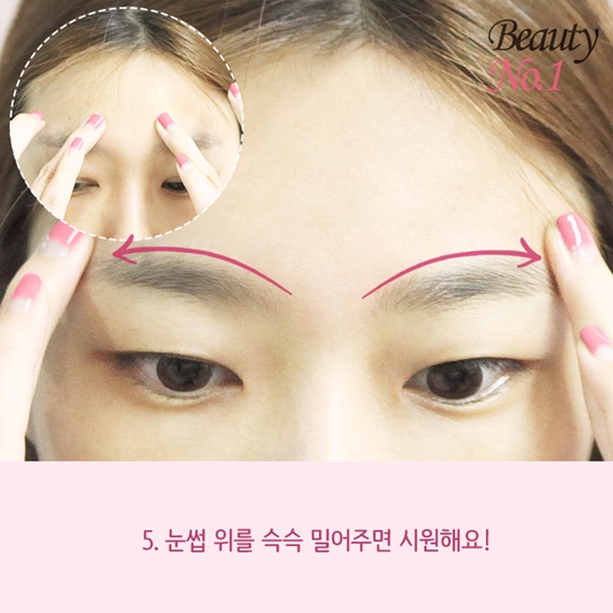 用无名指按摩眉骨位置,方向是从眉头到眉尾。